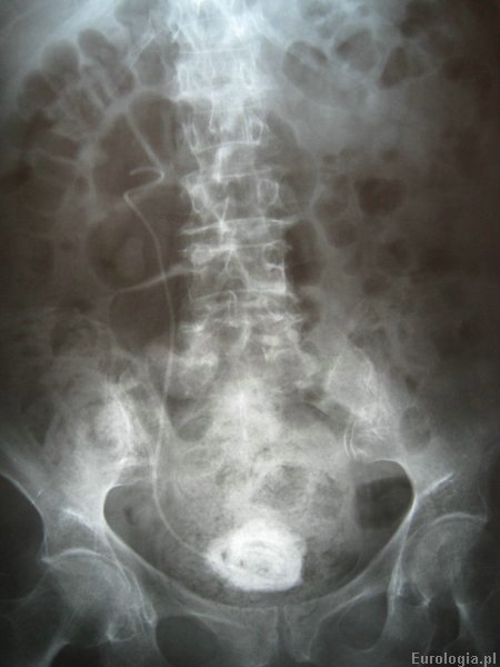 Fot. RTG przeglądowe nerek i pęcherza moczowego z widocznym cewnikiem DJ w prawym moczowodzie i kamieniem moczowym na końcu pęcherzowym cewnika.