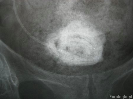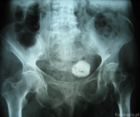 Fot. Kalcyfikacja cewnika DJ - złóg średnicy 5 cm na końcu pęcherzowym cewnika.